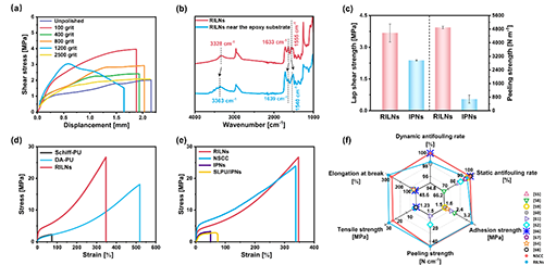 �D4. �C�����W����. (a)��ͬ��ĥ�l����RILNs�Ĵ�Ӽ�������; (b)���wRILNs�ͭh�����Ăȵ�RILNs�ļt����V�D; (c) RILNs��IPNs���ӵĴ�Ӽ��Џ��Ⱥ̈́��x����; (d)Schiff-PU��DA-PU��RILNs�đ���-��׃����; (e) RILNs��NSCC��IPNs��SLPU/IPNs�đ���-��׃����; (f) NSCC��RILNs�ĄӑB/�o�B�����ʡ�ճ�ӏ��ȡ����x���ȡ����쏊�ȡ��������L�ʼ����c�īI�з���Ϳ�ӵČ���.