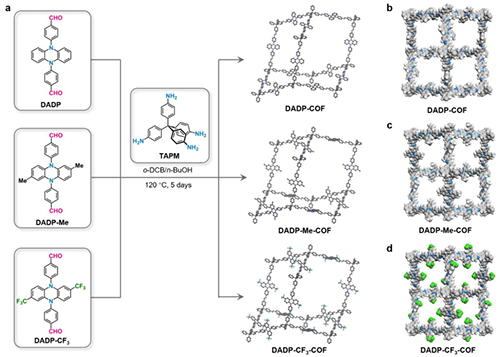 �D1. (a) COFs�ĺϳ�·����(b) DADP-COF��(c) DADP-CF?-COF��(d) DADP-Me-COF�ĽY��ʾ��D��̼-��ɫ����-�{ɫ����-��ɫ����-�Gɫ����