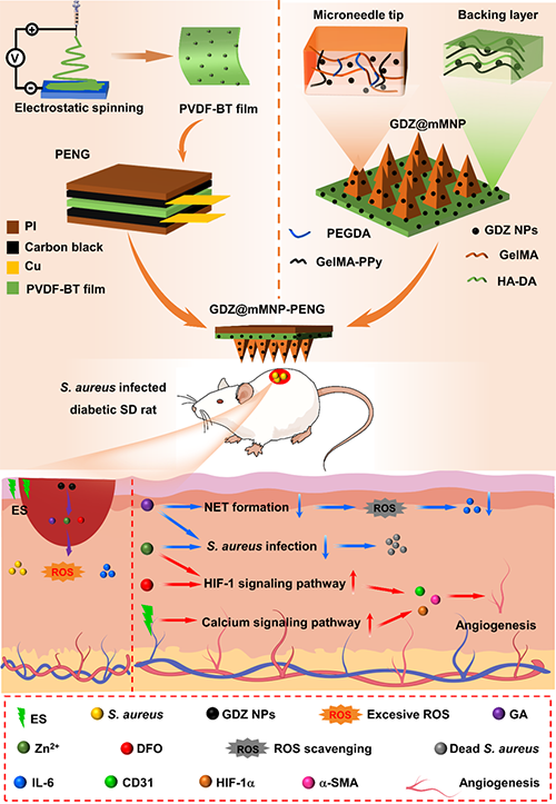 ԭ��朽�: Weikun Li, Xin Tan, Yanling Liang, Nuoya Chen, Diyi Feng, Yinghua Tao, Tao Liu, Xiaojing Wu, Huiqing Lu, Ling Liu, Feiling Feng, and Liqin Ge. Multifunctional microneedle patch synergized with electrical stimulation to regulate microenvironment for enhanced healing of infected diabetic wounds. Chemical Engineering Journal, 2025, 159255.