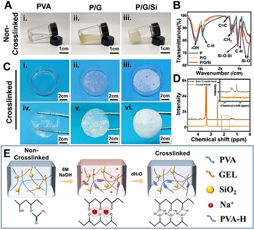 �D2. ӡˢ��ī���Ƃ�ͽ���(A)��ǰPVA��P/G��P/G/Siӡˢ��ī�����Ժ����ȵı��^��(B) PVA��P/G��P/G/Siӡˢ��ī��FTIR���V��(C)����PVA��P/G��P/G/Siӡˢ��ī�����Եı��^��(D)δ���ͽ���ī��1H-NMR�V��(E)�cNaOH���C��ʾ��D����PVA- h����PVAˮ���z��