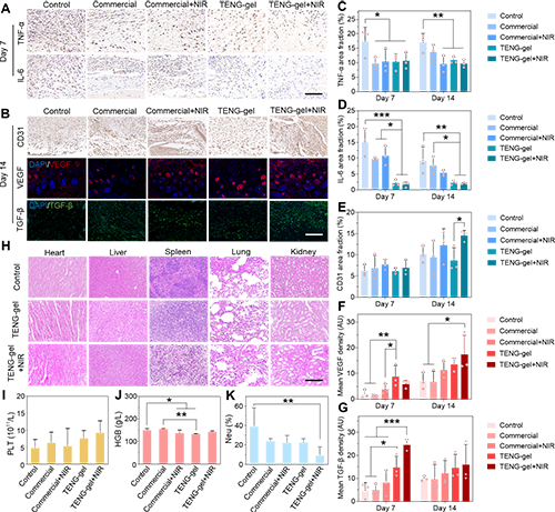 �b��TENG-gel���w����г�ɫ�Ŀ������ԡ��o���Թ���������p�������ܣ��о��ˆT��С��ȫ��Ƥ�wȱ�pģ����ȱ�pֱ����7 mm�����u����Ƥ�w�������ܡ��������3�죬�քeʹ�Ì����M����Ʒ���ϽM����Ʒ���� + NIR�M��TENG-gel�M��TENG-gel + NIR�M�M��̎�����S���ڵ�0��3��6��9��1��14���^��������Ϡ�B���w�ȵĴ�������Ƭ�������]�Ϻ��E�͂����տs��e���D6A?C���@ʾ��̎��3����սM����Ʒ�����M���F�����װY�ͻ�ē�F������һ���̶ȵĸ�Ⱦ����TENG-gel + NIR�M�⣬�����M���g���9����F���@�İ̺ۺͽY��F��һ���棬����HQPS@MoS?ˮ���z����Խ����ˮ���ܣ�TENG-gel�ăȌ���Ч�����շ�������;ֲ����ڏ��������ւ��ڱ�������һ���棬PDMS/PTFE��Ĥ�������ˮ����ʹ�䌦�κα������|��ճ�����O�ͣ��Ķ��_���˷������ܣ���Ч�ر��o���������ⲿ��Ⱦ����ֺ���