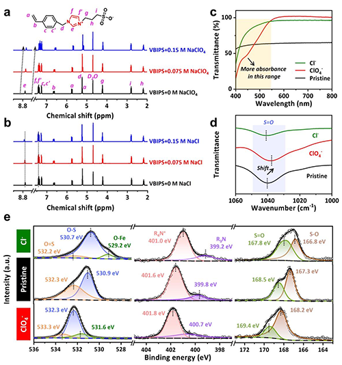1H NMR���V�Y���@ʾ����x������h��Hԭ�ӵ���̖�ڼ���NaClO4��l�����@ƫ��������VBIPS��ClO4-�x���a�������������NaCl�wϵ�Л]���^�쵽��ƬF����ͬ�r����Ҋ����V���t����V��XPS���@ʾ����ƽY�����@Щ�Y������VBIPS������x��������F��ͨ�^�cClO4-�x�ӽY���������䌦�F�x�ӵ��o��ų����ã��Ķ�ʹ�F�x�Ӹ��õ��c������a������á�����Cԓ�YՓ������߀ʹ��Fe(ClO4)3��Һ̎��pDVBAPSˮ���z�������h����x�ӆ�Ԫ����ͨ���@�}�Y������pSBMAˮ���z���o���h����x�ӆ�Ԫ�鼾�@�}�Y�������Y���l�FFe(ClO4)3�����������ɷN�����x��ˮ���z���@һ�Y���ٴα���������x�ӽY���cClO4-�x�ӽY�����F�}����pVBIPSˮ���z���^���аl�]��Ҫ���á�