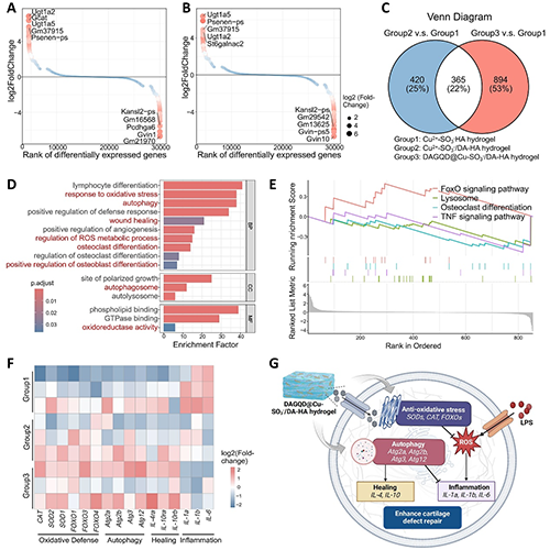 �D5 RNA�y���������A-B��������ɽ�D��Group 2 vs. Group 1�cGroup 3 vs. Group 1������C��������f���D����D��GO���ܸ��������������������ɡ��ޏ����Pͨ·������E��GSEAͨ·������FoxO��̖����ø�w���ƹǼ����ֻ��cTNFͨ·����F����Dչʾ�����������ɡ��ޏ��c�װY���P������_����G��ˮ���z���ÙC������ʾ��D