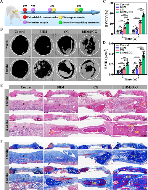 �о��ˆT�����˴����R��ߴ��B��ȱ�pģ���Mһ���u�������w�ȵijɹ�Ч�����D4A������D4B?D��ʾ��ͨ�^��Ӌ��C���Ӓ��裨micro-CT���ؽ������ǵ��ΑB��������BHM�M�У��g��4�ܺ�8���^�쵽�������ǽM���O�٣� CG�M�ijɹ��T���������ڌ��սM��BHM�M�����֮�£�BHM@CG�M��ȱ�p�^���܇����¹��γ��@�����ӣ��γ����ǘ����ȫ���w��ȱ�p��λ��ֵ��ע����ǣ��S���ޏ͕r�g�����L��BHM@CG�M�Ĵٳɹ�����Խ��Խ���@�������Mһ���u����������r���M�����Kľ��-���tȾɫ��Masson��ɫȾɫ���D4E��F�����ڌ��սM��BHM�M�У��w�S�M����Ҫռ��ȱ�p��λ���������ǽM���O�١����֮�£�ˮ���z���M���F�������@���¹��γɣ�����BHM@CG�M���g��4�ܺ�8�ܾ����F�����@���ijɹǻ��ԡ�