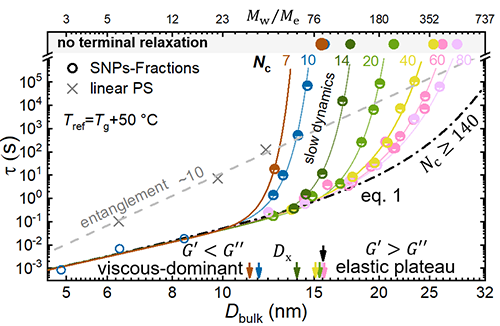 SNPs��Ҫ������Һ�ۺ��Ƃ䣬��ͨ�^�����ּ��@��խ��ɢ�Ę�Ʒ�����w�^����D1��ʾ����ͨ�^С����ʎ���Ќ��͕r�دB�ӵķ�����������ͬSNPs�����в�ͬ��ֱ��D�Լ����̶�Nc�����ɳ��О��������ɳڕr�g�������wDbulk�Ěw�{�R������D2�����о��ˆT����֮ǰ���ڴ�����ܛ�F�صĹ�����Giant 2021, 8, 100070; Macromolecules 2024, 57, 777-785�����l�F����ʹ�����¹�ʽ1����ܛ�{�����ӵĄ����W�О飺