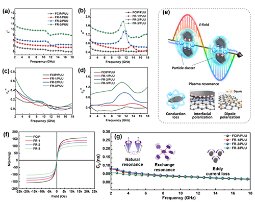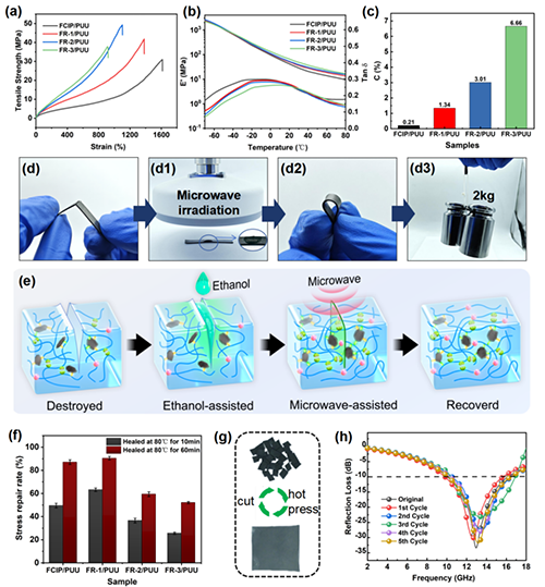��ˣ��A��������W(xu��)�����A���ں��Y�d�A�о��T�F(tu��n)�(du��)ͨ�^���x���o����ĥ���Ƃ���к˚��Y(ji��)��(g��u)���ʻ��F�ۣ�FCIP��/߀ԭ����ʯīϩ��RGO���s�����w��ԓ���w�����S���Ļ��Թ��܈F(tu��n)ʹ���w�܉����齻(li��n)���ģ��c�ϳɵ��۰����壨PUU�������w�M(j��n)�н�(li��n)����(y��ng)���Ƶþ��Ѓ�(y��u)�����W(xu��)���ܺ�늴Ų��������ܵ�FCIP/RGO/PUU��(f��)�ϲ������D1���������쏊(qi��ng)�ȸ��_(d��)49.2 MPa���������L�ʳ��^1100%���s�����w�����γ��~���ȱ�ݺ͘O�Թ��܈F(tu��n)��ʹ���O���p���������3����늴Ų��p�ęC(j��)�������S������(sh��)�F(xi��n)����늴Ų��Ĵ�/늅f(xi��)ͬ�p�����D2�����S��RGO���������ӣ��s�����w֮�g�ĵ��x�ӹ�������(qi��ng)���Y(ji��)��1/4���L����Ч��(y��ng)��FR-2/PUU��(f��)�ϲ����ں�Ȟ�1.76 mm�rչ�F(xi��n)���������B�m(x��)�p�����գ����ϵĵ���Ч���Վ�����EAB���_(d��)��7.03 GHz��10.97-18.00 GHz������С����p�ģ�RLmin����?52.31 dB���D3�������⣬����PUU���w�еĄӑB(t��i)�����I�Ͷ��ؚ��I���Լ�FCIP/RGO�s�����w����-�t�����̼�푑�(y��ng)��ʹ��(f��)�ϲ����ܿ������ޏ�(f��)����(j��ng)�^1 h���ӟ���(f��)�ϲ��ϵ����W(xu��)�����ޏ�(f��)Ч�ʺ����������ޏ�(f��)Ч�ʷքe�_(d��)��93%��95%���ڽ�(j��ng)�^5�λ����ټӹ����ϵ����쏊(qi��ng)����������90%���ϣ�����Ч���Վ���������׃��չ�F(xi��n)�����õĿ�ѭ�h(hu��n)��������ͬ�r��ԓ��(f��)�ϲ���߀���Ќ��t������푑�(y��ng)���Π�ӛ���������D4�͈D5����FCIP/RGO/PUU��(f��)�ϲ����ڿɴ����O(sh��)�䡢��׃�ΙC(j��)���˺�늴ŷ��o(h��)���I(l��ng)����ЏV���đ�(y��ng)��ǰ����ԓ�о��ɹ����}Ŀ��FCIP/RGO Functional Core-Enhanced Flexible Microwave Absorption Composites with Shape Memory Properties and Rapid Self-Healing Abilities Activated by Infrared and Microwave Stimuli���l(f��)���ڡ�Chemical Engineering Journal���ϡ�Փ�ĵ�һ�������A��������W(xu��)���ϿƌW(xu��)�c���̌W(xu��)Ժ��ʿ�о����Z����ͨӍ�������A��������W(xu��)�����A���ڡ�ԓ�о��õ������V�|ʡ���c(di��n)�I(l��ng)���аl(f��)Ӌ���(xi��ng)Ŀ��2024B0101040003����������Ȼ�ƌW(xu��)������12274095�����V�|ʡ��Ȼ�ƌW(xu��)����2025A1515010389������ɽ���ش�Ƽ��(xi��ng)Ŀ��2020AG022�����Y����
