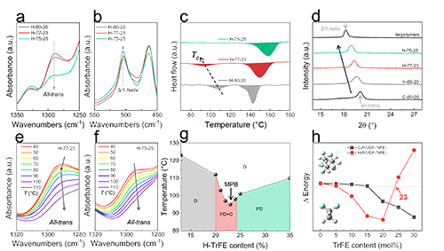 �D3.������׃����Y����(a �� b) H-P(VDF-TrFE) �� FTIR ��ȫ��ʽ���� (a) �� 3/1 �������� (b) ���Տ����S TrFE ����׃������r��(c �� d) ��ͬ TrFE ������ H-P(VDF-TrFE) �� DSC (c) �� XRD (d) ������(e �� f) H-77-23 (e) �� H-75-25 (f) ��ȫ��ʽ����ļt�����Տ����S�ضȵ�׃����(g) H-P(VDF-TrFE) �����D���ض��ɽ�늷�ضȣ�1 kHz �Ĝض��V�����_���������У���O������D�� �� ��PD�� �քe���������ࡢ�o����͂Οo���ࣻ(h) ��ͬ TrFE ������ C-P(VDF-TrFE) �� H-P(VDF-TrFE) ��ȫ��ʽ�����c 3/1 ���������������� DFT Ӌ��Y����