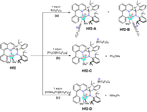 ������̽��ԓϵ�д��������C������������ͨ�^ԭλ�˴��c�ܶȷ�����Փ(DFT)Ӌ�������_�˴���Hf2�c�������Ļ�^�̣��D3�����Y����������Hf2�cB(C6F5)3�����r�������x���Ե�Ó��Hfԭ��������һ��������Hf2�c[Ph3C][B(C6F5)4]�����r���t���l�������x����Ó������Hf2�c[HNMe2Ph][B(C6F5)4]�����r���x���������B�ӵı�����ͨ�^�|�ӻ����Ô���Hf�CC(����)�I��