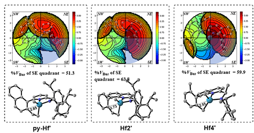 ����߀���ð����w�eӋ����ʾ��ԓ�������Ч���^���@һ�����F�����D5�����Y���������cHf2����%VBur = 63.8����Hf4����%VBur = 59.9����ȣ�py-Hf���چ��w����^��İ����w�e��%VBur = 51.3���@����С���@������Hf2��Hf4���^��Ŀ��gλ����K��1-��ϩ�ȴ�λ��ϩ�N���w����λ�������Ķ�������1-��ϩ���w�Ĺ���������