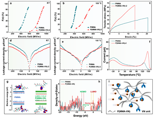 ���գ�������ͨ��W���W�WԺ��־�ɽ��ڈF���������ͨ��W�ڶ������tԺ�ߵǷ���ڈF������һ�N���²��ԣ�ͨ�^�������h�������w�e�c���Y���ąfͬ�{�ؙC������Ч����ż�O�����B�ۺ����и������ܶ��c�������p��֮�g��ì�����D1�����о��F�ͨ�^��2-��ϩ������2-VN���c����ϩ�������MMA�����ۺϣ��ɹ��ϳ���һ�N���͟oҎ������P(MMA-VN)���D2������������Ą������h�Y����Ч�����˼��Ȼ��������w�e�������˾ۺ���ĘO�����������@�������˳�ԥ�p�ģ��D3�������⣬���h���ܼ��Y�����{�������������ܼ����������d���ӷ��@��������Ч������©���p���Լ�������c늓������L�U���D4������VN������5 mol%�r�����ϵă��������������800 MV/m��늈���չ�F���������ܣ������ܶȸ��_19.3 J/cm3�����Ч�ʳ��^89%���D5�����ڽ^���ш���ľۺ������늲�����̎���I��ˮƽ���D6�������Ƃ��P(MMA-VN)��늲����ڌ��F�������ܶ��c�߷��Ч�ʅfͬ������ͬ�r����߃�������Һ�ӹ��Լ���/�Cе�����ԣ��߂����õ�Ҏģ���Ƃ䝓����������늄���܇����������Դϵ�y�c��������������I�����M�������������x���ϡ����⣬ԓ�OӋ���Ծ����^�������m�ԣ�����չ�����������ۺ����wϵ�����_�l��һ�������ܽ�늲����ṩ��ͨ��ƽ�_��ԓ�о���������Ĥ������������惦�����_������·����չ�F���ڽ�������惦�I��ďV韑���ǰ����
