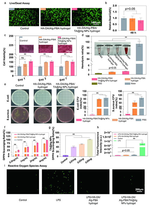 �D3.ˮ���z�����������ԡ������Ϳ����������yԇ����a�� 48 С�r�Ļ�/���u����Ƭӛ�;��b�� 48 С�r��/���yԇ�ĽyӋ����;��c�� �� 1 �� 3 �� 7 ��� CCK-8 �����Y��;��d�� ˮ���z����Ѫ�О�;��e�� ����䁰�Ͷ����yӋ�Y��;��f�� ˮ���z�� DPPH ����Y��;��g�� TA@Ag NP �� DPPH ����Y��;��h�� ROS �ğɹⶨ���yӋ;��i�� �������y���D�� ��*p<0.05��** p<0.01��n=3����