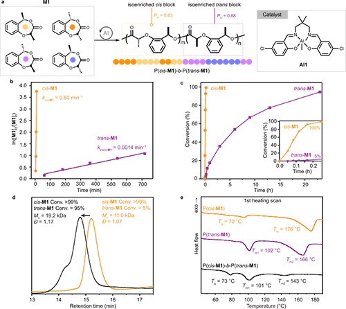 ��ǰ��̽���Y����������Al1��cis-M1��trans-M1�ľۺϾ����F���߶ȵ�ȫͬ�x���Ժ̓����Ŀ����ԣ������������Al1����̽����cis-M1��trans-M1��φ��w��һ偷��ۺ�(�D4a)�������W�о� (�D4b) �����ۺ��^�̷���һ�A�����W����cis-M1��trans-M1�ľۺ����ʴ������@�(kcis/ktrans = 357)����˿���ͨ�^���к����w�����γ����w��Ƕ�ι�������ۺ��^���M����1H NMR��SEC�ıO�y (�D4c,d)���O�y�Y����Ƕ�ξۺ�����γ��ṩ�˴_菵��C������Ƕ�ξۺ���Ҳ�M����DSC���� (�D4e)���Y������������^�ߵ������D׃�ضȡ�