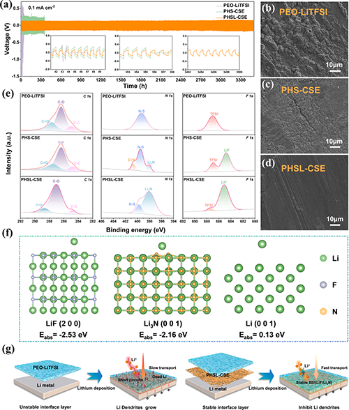 Fig. 5. Long-term cycling performance and morphological characterization of lithium metal surfaces.(a) Cycling stability of Li/Li symmetric cells with PEO-LiTFSI, PHS-CSE, and PHSL-CSE composite solid electrolytes at a current density of 0.1mAcm-2. (b-d) SEM images of lithium metal surfaces after 50 cycles for Li | PEO-LiTFSI | Li cells, and 100 cycles for Li | PHS-CSE | Li and Li | PHSL-CSE | Li cells. (e) XPS spectra of the lithium metal surfaces after cycling.(f) Adsorption energies of Li+ on LiF (200), Li3N (001), and Li (001) interfaces. (g) Schematic representation of the lithium deposition mechanism using PEO-LiTFSI and PHSL-CSE composite solid electrolytes.