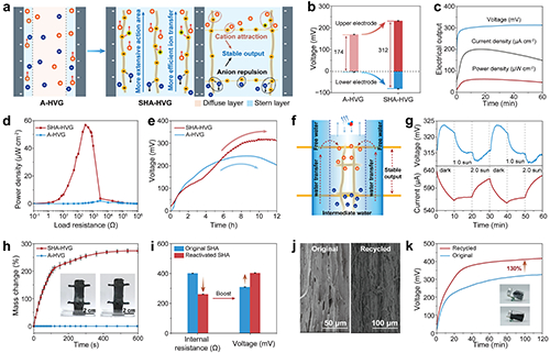 ��ľľ�|��ͨ�^ë�����ú����v�������Fˮ�ֿv���Ч�\ݔ��ͬ�r�ȱڿ����渻����ؓ늺ɹ��܈F����-COOH��-OH�ȣ���ͨ�^�o����������@�����M��K?��Ca2?��Mg2?�ȵV�|��x���B�ֵ������c�D�\���ܴˆ��l������������푑������z�c��x��ˮ���z�fͬ�M�b���ԣ��OӋ��һ�N��ȫ���ݔˮ/�l늵Ě����z-ˮ���z��Ԫ�wϵ��SHA-HVG�������У�ʯī���s��PVDF�����z��G-PVDF�����и߹��Ч���͵͟ጧ�ʣ���������Կ���ṩ��ֱ���ݶ������F��Ч����̫������l��ISDE����ͨ�^���m����՝B��-ԭλ�ۺϲ�������G-PVDF�������������PNIPAMˮ���z��S-PNIPAM�����γɴ�ֱ�H-��ˮ�ݶȣ��ײ��Hˮ���M�l��ˮ��픲���ˮ���M���l���p�ٟ�Uɢ��ģ�Mֲ�����v���Ì��F���m�zˮ��ݔˮ��ˮ���l���@�N�fͬ�OӋʹSHA-HVG��ģ�M��ˮ�ă���Ч���_��2.75 kg·m?2·h?1���^��һ�����z������A-HVG������300%��ͬ�r�����ữS-PNIPAMˮ���z������ˮ����x���w�ơ��γɸ��ܶ��p늌ӣ�EDL�����x�ӝ���ݶȣ��@�������x�����ݔ�������F56.86 ��W·cm?2�ķ�ֵ�����ܶȣ��^A-HVG����2669%�������ںڰ��h�������ܾS���x�ӂ�ݔ�����Fȫ����l늣�24С�r�B�m����늉��c���ݔ�������c�F��HVG���������SHA-HVG�����lЧ�ʡ������ܶȡ����؏ͼ����ԡ��ɻ����Ժ�ҹ�g�l�������������F����Խ�ԣ��Ҿ��гɱ����ݣ������ƄӸ�Ч��ˮ�����ͷֲ�ʽ�坍��Դ���g�lչ�����������B�r�I�ȑ����ṩ��˼·���D1����