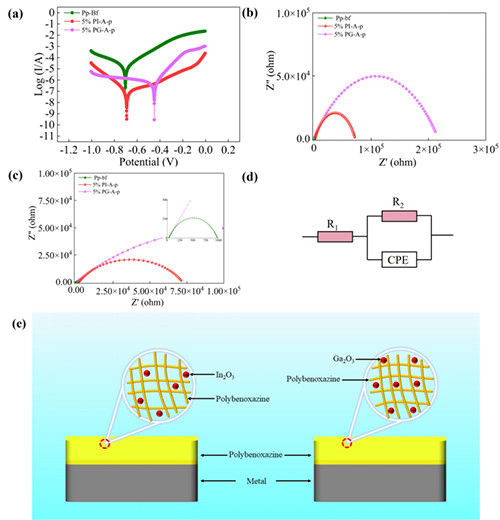 �D3. (a) 3.5% NaCl 늽��|��Һ�е�Tafel������(b) 3.5% NaCl늽��|��Һ�� Pp-Bf��5% PI-A-p �� 5% PG-A-p Ϳ�ӵ�Nyquist�D��(c) Nyquist�ֲ��Ŵ�D��(d) Ϳ�ӵ���Ч�·�D��(e) ���o�C�ơ�