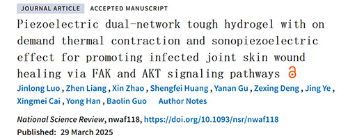 ��ǰ��������ͨ��W(xu��)�����ֽ��ڡ����½��ں��w�θ����ڈF��ڡ�National Science Review���ϰl(f��)�����¡�Piezoelectric dual-network tough hydrogel with on demand thermal contraction and sonopiezoelectric effect for promoting infected joint skin wound healing via FAK and AKT signaling pathways���������һ�N�߂䰴����տs�ͳ��̼����Ч��(y��ng)���p�W(w��ng)��?f��)�Y(ji��)��(g��u)�ߏ��gˮ���z���ϣ����F(xi��n)�����A�΄ӑB(t��i)�D(zhu��n)���ί��cȫ�^�̂��ڹ������ί����ԡ�UNMxˮ���z���|(zh��)�ĵ�һ���W(w��ng)�j(lu��)��������ͪ��UPy���������z��GU���M�ɣ�ͨ�^UPy���F֮�g�Ķ��ؚ��I�M�н�(li��n)���ڶ����W(w��ng)�j(lu��)��N-��������ϩ������NIPAM���ͼ���ϩ�����z��GMA���M�ɣ����^�����@��APS�����l(f��)���M���p�I���ɻ��ۺϡ�Ȼ���߂䉺����ܵĽ�{���w���������^�{���w��BTO@Auؓ(f��)�d��UNMxˮ���z���|(zh��)�У���K�@�õ�ˮ���z����UNMx/BAy��BA��ʾBTO@Au�������������ӟ�푑�(y��ng)�տs�ͳ��̼����Ч��(y��ng)�錧(d��o)�İ���ROSጷź;ֲ�늴̼����ܣ���ɴ��M�\�Ӳ�λƤ�w���Ԃ������ϡ�