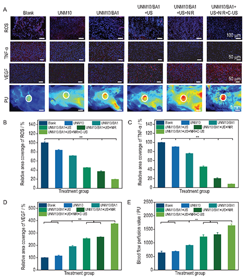 �D5. (A)��5���w��(n��i)ROSȾɫ����5��TNF-�����ߟɹ�Ⱦɫ����15��VEGF���ߟɹ�Ⱦɫ�͵�5�켤������ճ���Ĵ����ԈD��(B)��5���w��(n��i)����ROS���������y(t��ng)Ӌ��(C)��5��TNF- �����������_�����y(t��ng)Ӌ��(D)��15��VEGF���������_�����y(t��ng)Ӌ��(E)��5�섓(chu��ng)��ƽ��Ѫ����ע�����y(t��ng)Ӌ��
