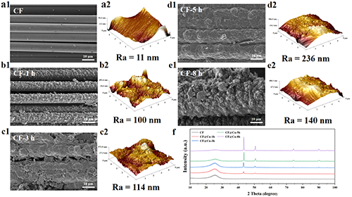 �D2. ̼�w�S��늳��e�^�̣�(a1-e1) ��ͬ늳��e�r�g��CF����Ē�������@�R(SEM)�D��(a2-e2) ��ͬ늳��e�r�g��CF��ԭ�����@�R(AFM)�D��(f) CF��X�侀����(XRD)������
