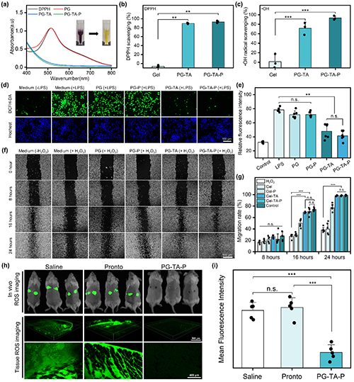 �Mһ����PG-TA-Pˮ���z��Ĥ�Ŀ����������M���о����Y��������PG-TA-P������Ч���ROS���ɻ���2,2-������-1-�����������ɻ���DPPH�����u�����ɻ�������ʷքe���_92.89 �� 2.08 %��92.28%��3.42%������������������Y��������֬���ǣ�LPS���̼��@�����������ɼ������ȵ�ROSˮƽ����PG-TA-P���@��������ɼ���ROS���^������p���ij��w�S�����w�ƌ��Y��������PG-TA-P����Ч�����^�����䌦������ɵ������p�������M�����w�ơ����w�ɹ����ϵ�y�ͼ�����蹲�۽��@�R�Ļ���������Y���������c�����}ˮ��Prontosan (B. Braun)��ȣ�PG-TA-P���ί���24С�r���@�����������M���е�ROSˮƽ���D5�������ϽY��������PG-TA-P����Ч����w��/�w���ROS���Mһ����Ч��ֹROS�ھ��ɼ����װY��̖�����е��P�I�����������ڄ�������ϡ�