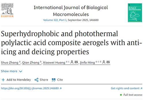 ���գ����u��W���½��ڷǿ�����ψF̎������ھ������w�S�ͺϚ����z����/���������_�l�I��ȡ���Mչ�����P�о��ɹ����}�顰Superhydrophobic and photothermal polylactic acid composite aerogels with anti-icing and deicing properties����Փ�İl���ڡ�International Journal of Biological Macromolecules���ڿ���ԓ�о������һ�N������/̼�{��/���������F��CFe-PLA���ͺϚ����z��ͨ�^���W�����������Ȼ�̼�{�ܣ�CNTs-COOH���c���F�V��Fe3O4���ɹ��ͺϣ��Ƃ�����Թ��{�����ϣ�CFe��������VTMS�����������ȷ������Ƶþ������S��3D���W�j�Y���Ĺ�ἰ����ˮ�����z��ԓ�����z�߂䃞���Ĺ��Ч�����@���ķ���/�������ܺ����õ��;�����߀���г���ˮ�ԣ����|��146.94��-152.25�㣩�����ܶȣ�22-32 mg/cm3�����������@헹������Ƃ�����ȫ���������õ����M�������z�ṩ��һ�N�·f��Ч�ķ�����