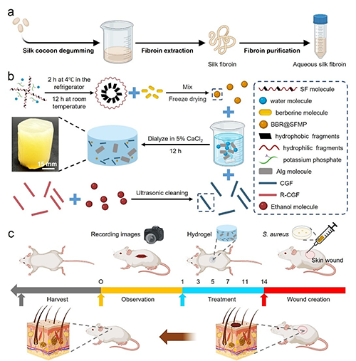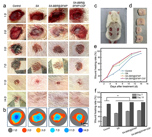 ���������������ƺ��A�����ĵĽyӋ������ÿ��s��1000�f�˽��v��Ƥ�w�p��������ʹ�ࡣ���������Լ���Ⱦ�Ԃ������R���o�������������������ڂ����ί�����Խ��Խ��Ҫ�����á����о��_�l��һ�N���͏ͺ�ˮ���z���ϣ�SA-BBR@SFMP-CGF����ԓ���ό����d�S�B�أ�Berberine, BBR���Ľz�ص��ף�Silk fibroin, SF����BBR@SFMP����ţ�ǹ��w�S��Calotropis giganteafiber, CGF���������������c��Sodium alginate, SA��ˮ���z���|�С�ԓ���ό��F���S�B�ص��LЧጷţ�>15�죩�����@��������ˮ���z�����W���ܣ���s�����_295.74 �� 27.45 kPa�����w���о��@ʾ���䌦���Sɫ���������Staphylococcus aureus���Ŀ����ʸ��_97.40 �� 0.53%��������������ֹѪ���ܣ���Ѫ��0.33%�����ڽ��Sɫ���������Ⱦ������ȫ��Ƥ�w����ģ���У�ԓ�ͺ�ˮ���z����չ�F�����������������ԣ�����Ч���M�������ϣ��@���܉���������Ѫ���γɡ�ë���������zԭ���e��ԓ���ܷ����܉���߂�������Ч�����s���ί����ڣ����ƻ����A�����ί��ɱ�������һ�������o�����g�ṩ����˼·��