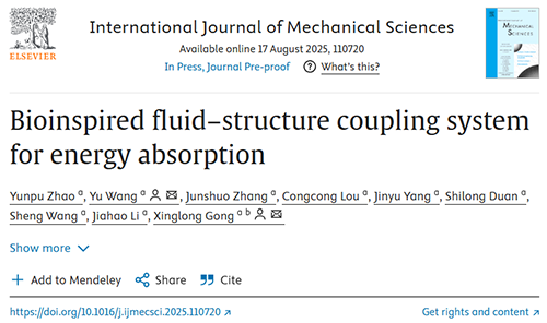 ԭ��朽ӣ�Yunpu Zhao, Yu Wang, Junshuo Zhang, Congcong Lou, Jinyu Yang, Sheng Wang, Jiahao Li, Xinglong Gong. Bioinspired fluid�Cstructure coupling system for energy absorption. International Journal of Mechanical Sciences, 2025: 110720.