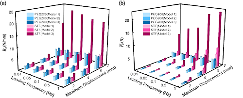 �ڲ�ͬ���d�l�ʣ�0.1 Hz�C1 Hz���͉��s��׃��0.25�C0.75�������s�������PEG-IKJS�ڴ�׃�Εr���F�����@�Ḻ́ڽ��|�c������ͬ��׃����STF-IKJS��������펧������������ƽ���˱�����|���䮔�����̾��_���|����ͬ�r���΅������Ȳ�����·�����{���@���T�����Ŵ��� STF �ļ�������푑���