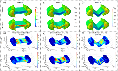 ��ϚW���C�������շ�����Coupled Eulerian�CLagrangian Method���Mһ����ʾ�����ٛ_��������Һ�ҵđ���������r�ͼ��������ֲ����������ƽY���������Ժͷ���������ɢ�C�����Y���@ʾ��STF�ڛ_�������܉�ͨ�^��������Ч���@���Ӿ����w���Ӻ̱ڽ��|��ͨ�^��߾��_�r�g���͛_������������������ɢ�����֮�£�PEG200�������^�ͣ��ֲ�������Һ���^��l���̱ڽ��|����������Ч���_���������⣬Model 1-3�Y���в�ͬ��Һ�ґ�׃�ͼ������ʷֲ��C���ˎ��{�ؼ���푑�����Ч�ԡ�