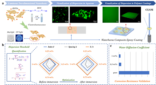 ���գ���ɽ��W(xu��)���W(xu��)�����c���g(sh��)�W(xu��)Ժ����n�}�M�����һ�N���ڴذl(f��)���(bi��o)ӛ�Ą�(chu��ng)�²��ԣ��״Ό�(sh��)�F(xi��n)��ˮ�ԭh(hu��n)������Ϳ����BNNSs���^���S��ɢ��ԭλ���o�p��������ҕ�������w���f���n�}�M�����̘I(y��)��������Ȳ�������������BEO�������l(f��)�����ԣ�Journal of Molecular Structure, 2025, 1347, 143323����ͨ�^���εķǹ��r(ji��)������^���ڵ�����{��Ƭ���棬��(g��u)���˿ɰl(f��)��Ķ��S�{��Ƭ��BNNSs@BEO����BEO�ھۼ���B(t��i)��ͨ�^���g����x�����I�������ԭ������Ч���g����x������I���x������ӣ��a(ch��n)����(qi��ng)�ɹ⣬�˷��˂��y(t��ng)Ⱦ�Ͼۼ������y�}���o���(f��)�s�ϳɼ��Ɍ�(sh��)�F(xi��n)BNNSs��ˮ��Һ�;ۺ���Ϳ���еĸߌ��ȶȟɹ���D1a����ͬ�r(sh��)���ں�Morisitaָ��(sh��)���u��ȫ�־����ԣ����w���g������ܶ���Փ���u�r(ji��)�ֲ��S�C(j��)�ԣ����������p����������ܣ������˲�ͬ������BNNSs@BEO��Ϳ���н���ǰ��ķ�ɢ��׃Ҏ(gu��)�ɣ��D1b�����о���������0.75 ~ 1.00 wt%�ֵؓ(f��)�d�µ�BNNSs@BEO�܉�?q��)��F(xi��n)����Ϳ���о����ɢ�������A���c�ۺ���������p�Y(ji��)�ڴ��ֵ��(n��i)�_(d��)��ƽ�⡣���⣬��(f��)��Ϳ����3.5 wt% NaCl��Һ�н���30��{��Ƭƽ���g����74.7 ��m�pС��63.2 ��m��ˮ?d��ng)Uɢϵ��(sh��)�½���5.41×10-5 cm2/h��������50%�����������^�����T��(d��o)�{��Ƭ�l(f��)�����ΔU(ku��)ɢ���M(j��n)һ����(y��u)����ɢ��B(t��i)���������ɢ����Ч���L���g���|(zh��)�U(ku��)ɢ·����չ�F(xi��n)��Խ���L�ڷ����������D1c�������P(gu��n)�о��ɹ��ԡ�In situ 3D visualization and quantitative mapping of boron nitride nanosheet dispersion in anticorrosive coatings via cluster luminescence labeling�����}�l(f��)���ڡ�Chemical Engineering Journal���ϡ�