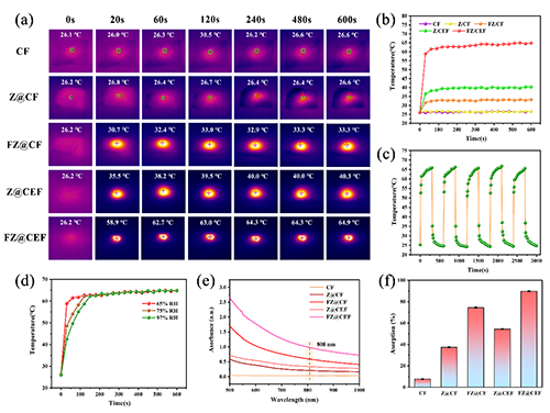�D6.��a����Ʒ��808 nm���t�������600 s��0.2 W/cm2���ļt������DƬ����b����Ʒ�ڲ�ͬݗ�Օr�g�µĜض���������c��FZ@CEF���_�Pѭ�hݗ�Ռ���еĜض�׃���D����d��FZ@CEF�ڲ�ͬ��ȭh���еĜض���������e��UV-vis-NIR���V�D����f����Ʒ��808 nm̎�Ĺ���������