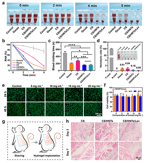 �D7. CS/HNTsˮ���z���w��ֹѪ���������������ԡ�(a) �w����Ѫԇ����Ƭ��(b)����Ѫ�t���װٷֱȷ�ӳ���ڕr�g�c�ĸ����ϵ���Ѫ�M�̡�(c) ȫѪ���̕r�g��(d) ��Ѫ�ʡ�(e) L929�����Ļ�/��Ⱦɫ�D��(f) ���������z�y��(g) ˮ���zƤ��ֲ���ʾ��D��(h) ֲ��^��M����H&EȾɫ��