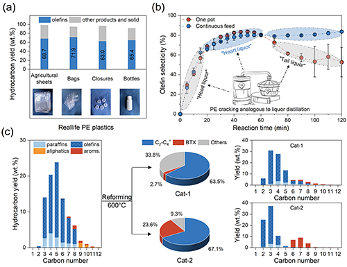 Efficient conversion of polyethylene to light olefins by self-confined cracking and reforming