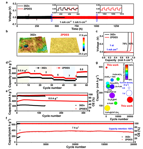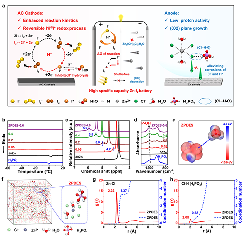 ���ڣ��|�A��W���W�c�����WԺ������/�����F�����˻����������늽��|��ZPDES����늽�Һ�{���²��ԡ��о�������H3PO4�cZnCl2֮�gͨ�^���I�������Cl···H-O������DES��ԓ���I�܉���Ч����Cl-���|������ĸ��g��ͬ�r���|�ӿ�������I+��ˮ�⣬���MI0/I+�Ŀ�������߀ԭ�������Ķ�����I3-���γɣ���߷��������ԡ����⣬�|�Ӵ��MZn����002�����惞�ȳ��e������������֦�����L���Y������������ZPDES��Zn-I2늳���0.5 A g-1��ѭ�h320�κ����ܱ���576 mA h g-1�ĸ߱���������7 A g-1��ѭ�h20,000�κ����ܱ���100%�����������ʡ����о����ƄӸ����������Zn-I2늳صČ��H�����ṩ���µ�˼·��