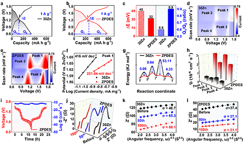 �����ڳ���������GCD��Ӌ���˘O��늉�����E����Q1/Q2��ֵ���Y������ZPDES����Ч��������߀ԭ��������ͬ�����µ�ѭ�h��������CV���yԇ�Mһ���C��ԓ늽�Һ��������߱�������ͨ�^Ӌ��Tafelб��������߀ԭ�܉���ʾ�������������߀ԭ�����W��ͬ�r���\�x�ӔUɢϵ���ĽY��Ҳ������ZPDES��Zn2+���и���ĔUɢ�О顣늻��W�迹�V��EIS�������@ʾ���ڲ�ͬѭ�h�l���£�ZPDES�wϵ��늘O���и��͵�늺��D�����ͺ���Ч���x�ӔUɢ�^�̡�