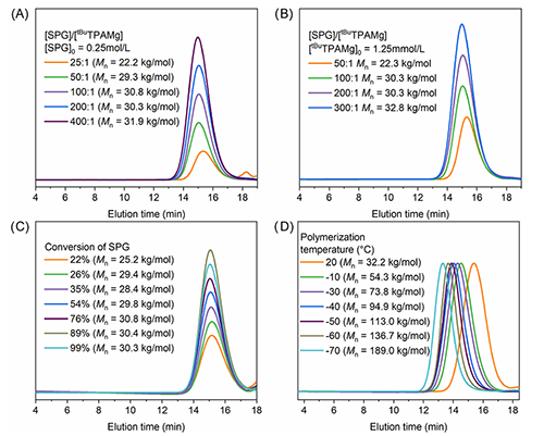 �D1����A��[SPG]0 = 0.25 mol/L����ͬ[SPG]0/[tBuTPAMg]0 ������GPC�ѯB�D����B��[tBuTPAMg]0 = 1.25 mmol/L����ͬ[SPG]0/[tBuTPAMg]0 ������GPC�ѯB�D��C����ͬ�D(zhu��n)�����µ�GPC�ѯB�D��D����ͬ�ۺϜض��µ�GPC�ѯB�D��