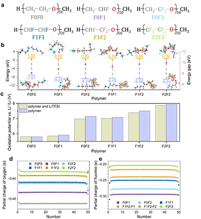 �D1. ���� PEO ��늽��|����ӽY���c���W�����ԡ�(a) PEO��F0F0��������������F0F1��F0F2��F1F1��F1F2��F2F2���Ļ��W�Y����(b) �ۺ��������w�����ռ������܉����HOMO���c���δռ������܉����LUMO�����ܼ���܉���ֲ����S�������̶���ߣ�HOMO �ܼ�������HOMO�CLUMO ��϶�������������M�������x�Ķ��������W��������(c) ���}�c�����}�l���µķ��� PEO �����w����Փ�����λ�������� Li/Li+����(d, e) �ۺ�������ԭ���c��ԭ�ӵľֲ�늺ɷֲ����Y���@ʾ���S�������̶��������ۺ�����ԭ�ӵľֲ��ؓ�Խ����������������ϵķֲ����Ӿ��D�����ֱ�ʾ�������w�����ҵ������F1F2-F1 ��ʾ�η��h���µķ���F1F2-F2 ��ʾ�p���h���µķ���