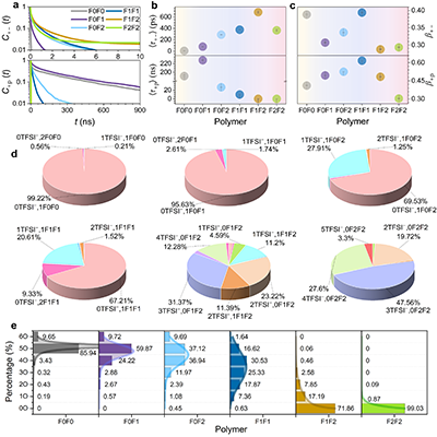 �D4. �����ۺ���늽��|��Li+ ��һ��λ���ӵĄ����W�c�Y����(a) Li+�CTFSI?��C+-��t�����c Li?�C�ۺ���Σ�C+p��t������ͣ���r�g�����P������(b) ��Kohlrausch�CWilliams�CWatts��KWW�������M��C��t���õ���ƽ����ԥ�r�g��<��+->��<��+p>����(c) ����������ָ������+-����+p�����Y�������������ձ����L�� Li+�C��x�ӵ���λ������ͬ�r��׃��Li+�C�ۺ�����λ�h���ľ�һ����(d) ���wϵ��Li+ ��һ��λ���ӵĽY���M�ɣ��@ʾ�S�������������ۺ������ı����½�����x����λ����������(e) Li+ �c�ۺ������ĵ�����λģʽʾ��D����ʾ�˷����̶��cģʽ�� Li+�C�ۺ�������õ��{��Ҏ����