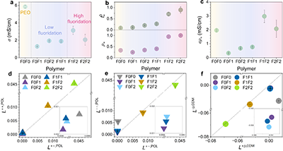 �D2. �����ۺ���늽��|���x�ӂ�ݔ���|��(a) �S�����̶��������x��늌��ʣ��ң����w�½����D�в�ͬ�ɫ�Ӱ�������������^�g���Ƿ������Sɫ�����ͷ������{ɫ���߷������tɫ����(b) �S������������x���w�Ɣ���t0+������x������֔�����+����u���ߣ��������������˾ۺ����CLi+ ��λ���������x���x���Ԃ�ݔ������(c) 늽��|�C����Ч������+������������c����֔��ij˷e���Y���@ʾ��F1F2 �wϵ�ڌ�����cLi+ ��ݔ���|֮�g���F�ƽ�⡣(d�Cf) Onsager ���fϵ����ʾ�˲�ͬ�����^�g��ͬ��N�\�����P�ԵIJ����(d) L+-,POL�cL++,POL �Č��ȣ���e�� L+-,POL�cL--,POL�Č��ȣ�(f) �x���C�ۺ����Onsager ���fϵ���� L+p,COM�cL-p,COM����