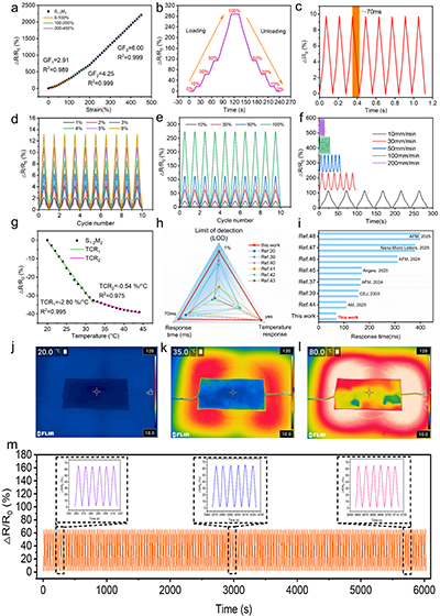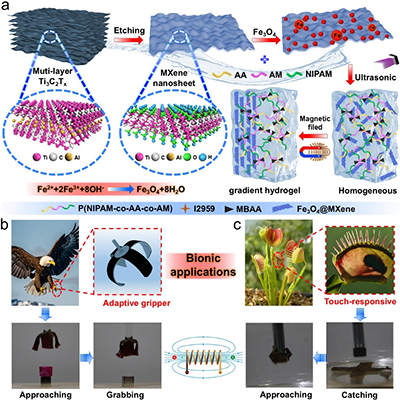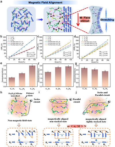 ���������\���c���r���й����ھ��|�������y�Լ��ݣ������@�ɴ��ܵ�ܛ�w�C�����_�l�����R��������Ȼ�繲��ϵ�y���l�����ݴ�W���ꖽ����c���Ϲ��I��W���ν��ڈF�ͨ�^�ň��T���M�b�����_�l��һ�N�{�ͺ����ˮ���z��ԓ��������Fe3O4@MXene��ˮ���z�W�j���γ��ݶȷֲ����Ķ����F�˴����c��׃���������ąfͬ�����Ƃ��ˮ���zչ�F���������ԣ����Ì���ԣ�2.6 mS/cm�����ߑ�׃�`���ȣ�GF=6��������׃푑�������0�C580%���̓�����ƣ���ԣ�500Ȧ����ͬ�r�߂�30�� /s�Ŀ��ٴ����ٶȡ�ԓ�о��ĺ���ͻ���������c�����چ�һ�����Ѕfͬ������ʹ���܉���г�����׃��ͬ�r���r�O�y�����\�Ӡ�B���@һ����ͨ�^�������õõ�չʾ����ץȡ�����ڸ�֪���w���{��ץ�����������Ɍ��rۙ�����\��܉�E�����о��阋�����Ѓ��ڷ����C�Ƶ�����ܛ���|�ṩ���·�ʽ�������m��ܛ�w�C���ˡ������t�W���˙C�����I���_������;����