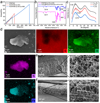 �D2. ��a��PNIPAM��P(NIPAM-co-AM)��P(NIPAM-co-AA-co-AM)ˮ���z�đ���-��׃��������b��P(NIPAM-co-AA-co-AM)ˮ���z���c��Fe3O4@MXene�ͺϺ��ļt����V����c��Sn:2M2��S1:2M1�cS1:2M2ˮ���z��һ�S�V��X�侀����D�V����d��Fe3O4@MXene��EDSԪ�طֲ��D����e��Sn:2M2�c(f) S1:2M2ˮ���z�M����ĵͱ��c�߱�SEM�����D��