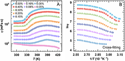 �S��朷�����Mw����HnmG50��Һ�ڵ����ߜ^�ğ����׃ϡ�F����u�p�����М����^�g�t���@׃����������ֵ�ضȣ�Tmax����372 K ������405 K����ֵ�ȣ���max����660 mPa×s�@��������4670 mPa×s�������^�L������������γɸ����̵�PNIPAM���W�j�����ڕr�دB��ԭ�혋�����r�g�CMw�B�������@ʾ����ͬMw�wϵ��ln��max�߶��غ��������б��һ�£��s��14����ӡ�C������C����ͬ������Gompertz���̔M�����^��Regime II�����������l�F����������max-��ass�cMw�ʃ����Pϵ��~Mw1.75�����������_ʽ��