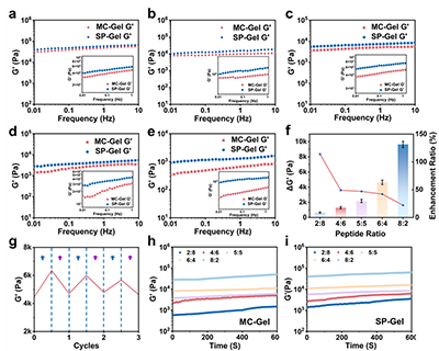 �D2. (a�Ce) ��ͬ�ı�����a��2:8��(b) 4:6��(c) 5:5��(d) 6:4��(e) 8:2 �l���£�MC-Gel �c SP-Gel �ڹ��������µă���ģ����G����׃����(f) �����؏͌�����ò�ͬ�ı�����ģ��׃��������G������ƽ��ֵ������������(g) 5:5 �wϵ����݆��Ҋ�� / �����ѭ�h�еĿ��愂���ГQ�О���(h) δ����ǰ��ͬ���� MC-Gels �� G�� �S�r�g��������(i) ���պ�ͬ���� SP-Gels �� G�� �S�r�g�����ԡ�