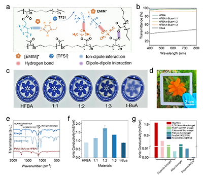 ͨ�^��������ϲ��Ԙ�������ˮ�����x�����z��������������ϩ������HFBA�����嶡����ϩ������t-BuA�����w�c��ˮ�x��Һ�w[EMIM][TFSI]��ϣ�ͨ�^UV���l�ۺ�2С�r���γɾۺ���W�j��Scheme 1a��������HFBA�з�ԭ�Ӹ��ؓ�ԣ����c�x��Һ�w��x�Ӯa�����x��-ż�O����ã���t-BuA���嶡��ͨ�^���I�c[TFSI]?��x�ӽY�ϣ��@�N�fͬ�����@�������˲��ϵ������Ժ��x���w���������D1a-c����ͨ�^�{��HFBA�ct-BuA�ı�������1:2���������x�����z���F��Խ�ľC�����ܣ���Ҋ�������_96.38%���D1d��������ȫ�[�Σ��x��늌���������1.74 mS cm?1���D1f�������ڶ���������x�����z�wϵ��FTIR��1H NMR�����C���˳���������õĴ��ڣ��D1e������C=O�I�t�ƺͻ��Wλ��׃�����������I���x��-ż�O�I���γɡ�