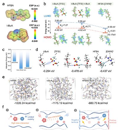 �D2. �x�ӂ����C����a) t-BuA��HFBA���ӵ��o늄ݣ�ESP���D��b) t-BuA-[TFSI]-��t-BuA-[TFSI]�Ct-BuA��HFBA-[EMIM]+�wϵ���ܶȷ�����Փ��DFT��Ӌ�㡣c) t-BuA/[TFSI]-��t-BuA/[TFSI]-/t-BuA��HFBA/[EMIM]+�������܌��ȡ�d) t-BuA/[TFSI]-��t-BuA/[TFSI]-/t-BuA��HFBA/[EMIM]+�ă������͡�e) �ڻ�ϭh���У���x��-��x�ӌ��ڼ�HFBA����t-BuA�����HFBA/t-BuA�ϵ�ģ�M�����ܡ�f) �x���w�ƙC��ʾ��D��