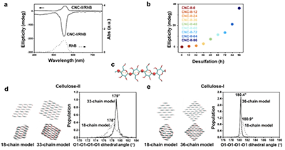 �D3��II���w�S�غ�I���w�S�ؾۼ��w�͆ξ����{�����Ա����� (a) ���͵�CNC-II-96/RhB�Ҹ�Һ��1.0 wt%/62.5 ��M���ĈA��ɫ���V�@ʾ����̖���c���͵�CNC-I/RhB�Ҹ�Һ��1.0 wt%/62.5 ��M����ؓ(f��)��̖�෴�� (b) CNC-II-t/RhB�Ҹ�Һ�ęE�A���S��Ó��r�gt (0�C96С�r) �����Ӷ����ӡ� (c) O1�CO1�CO1�CO1����ǵĶ��x�� (d) II���w�S�ص�18朻�33�ģ�͏�һ�˵���һ�˵���r����D(zhu��n)ҕ�D�����Լ�����(y��ng)�Ķ���ǣ��ң��� (e) I���w�S�ص�18朻�36�ģ�͏�һ�˵���һ�˵�형r����D(zhu��n)ҕ�D�����Լ�����(y��ng)�Ķ���ǣ��ң���