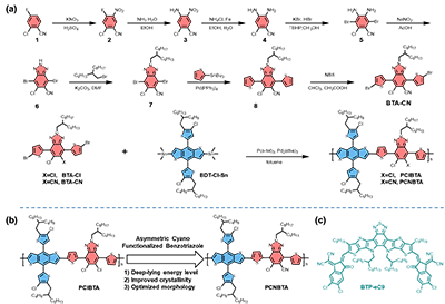 �D1. a) PClBTA��PCNBTA�ĺϳ�·����b) PClBTA��PCNBTA�����ܱ��^��c) BTP-eC9�ĽY(ji��)��(g��u)��
