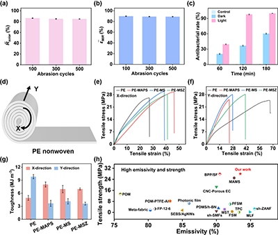 �W��������ϩ��PE���ǿ��첼����Խ�Ŀ������Ⱥ���ĥ�ԣ���ȱ�����е�ݗ����s�Ϳ������ԣ��@���������ڸߜغ�����Ҫ������h���еđ��á��о��ˆT�_�l��һ�N��ܾ���ϩ�ǿ��첼��PE-MSZ����ͨ�^��ݗ���֦��������-����ϩ���������������������飨MAPS����֦��PE�w�S�ϣ�Ȼ��ԭλ�ӌӳ��e�������裨SiO2���c��ʯ���������-8 ��ZIF-8��Ϳ�ӣ����F�˱���ݗ�������c����������ܵļ��ɡ��@�N�ּ��{�Y���x��PE-MSZ��̫ꖹⷴ���ʣ�90.8%���͏��мt��l���ʣ�93.5%����ʹ����ꖹ�ֱ�����^���yPE���ؼs4.5�档���⣬PE-MSZչ�F��Խ�Ĺ������Ч�ܣ���ģ�M̫�ݗ��l����120��犃ȿɌ��F���c�U���Ϳݲ�ѿ�ߗU��99.9%�Ŀ����ʡ�ԓ���Էǿ��첼ͬ�r���ָ߿������ȣ�28.1MPa����������ĥ�ԡ�������ϴ�Ժ����ԣ���Խ��ݗ����s�c����������Y�ϣ�չ�F���ڿɴ����O�䡢�������ɼ���һ����ܼ���Ʒ�I��ľ��Ý�����
