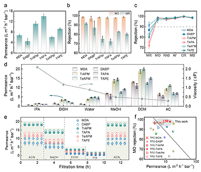 �D4 ���x���ܜyԇ�����NTFCĤ�ģ�a���״��B�ԣ���b�������Ⱥͼ��t�Ľ����ʣ���c������ͬ������Ⱦ�ϵĽ�����������d������ͬ�ЙC�܄��ĝB�ԣ���e��ѭ�h�B�Ԝyԇ����f��TFCĤ�c֮ǰ�����OSNĤ�����܌��ȡ�