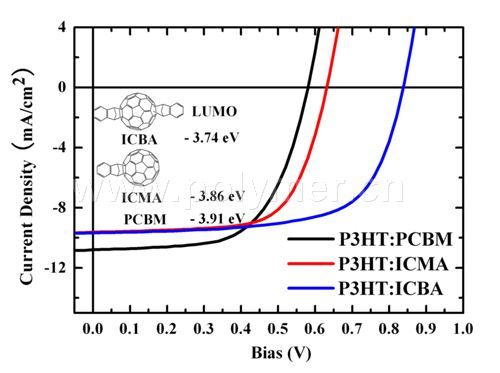 P3HT�Ϳ�����C60������PCBM(���ӽY��Ҋ�D3�е�F2)�Ǿۺ���̫���늳�����ߴ����ԵĽo�w�����w������ϡ�����P3HT/PCBM�Ĺ�����������D�QЧ�ʷ����_��3.5��4.0%���ң������������܌����ԌӺ�Ȳ�̫���У�100��300 nm�����ԫ@���^�ߵ�Ч�ʣ�����ˣ��@һ�wϵ�ɞ��Ƃ����e�ۺ���̫���늳ص���Ѻ��x����P3HT/PCBM�wϵҲ�����_·늉��ͣ�0.6 V���ң�������늺ɷ��x�����pʧ���ȱ�ݣ��@��Ҫ����������������ܼ�ƥ���Բ��ã�PCBM��LUMO�ܼ�̫�ͣ������Mһ�����M����P3HT�wϵ�Ĺ�����ܣ��ЙC���w�ҵ��о��ˆT�ϳ��˸���ӵ����p�ӳɵ�C60������ICBA����LUMO�ܼ��^PCBM����0.17 eV����AM1.5, 100 mW/cm2���l���£�����P3HT/ICBA�Ĺ�������_·늉��_��0.84 V,�����D�QЧ���_��5.44��,��ͬ�ӗl���£�P3HT/PCBM�wϵ���_·늉�ֻ��0.58 V�������D�QЧ��3.88������I-V����Ҋ�D2��