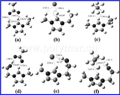 The optimized geometries of six ILs from B3LYP/6-31+g (d,p). (a) [EMIm][AC], (b) [EMIm][Cl], (c) [EMIm][PF6], (d) [HOEMIm][AC], (e) [HOEMIm][Cl], and (f) [HOEMIm][PF6] (H-bond is indicated as dashed line).